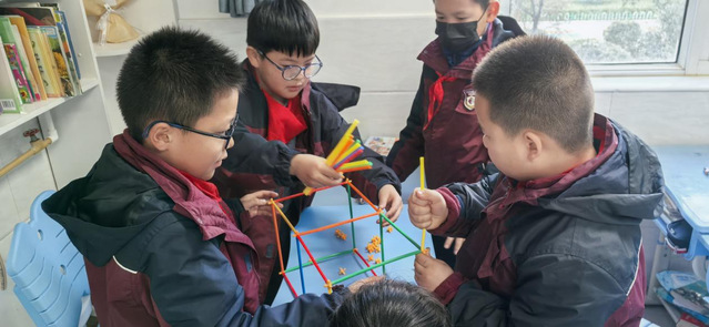 科技小课堂上,“小吸管,搭世界”创意结构搭建实验点燃了孩子们的探索热情。志愿者们以“‘中国天眼’、港珠澳大桥等科技成就”为导入,激发孩子们的创作兴趣。孩子们在志愿者指导下分组协作,有的负责拼接,有的专注调整结构稳定性。当各组完成作品进行展示时,用吸管搭建的“斜拉桥”“高塔”虽小巧却稳固,赢得了阵阵掌声。