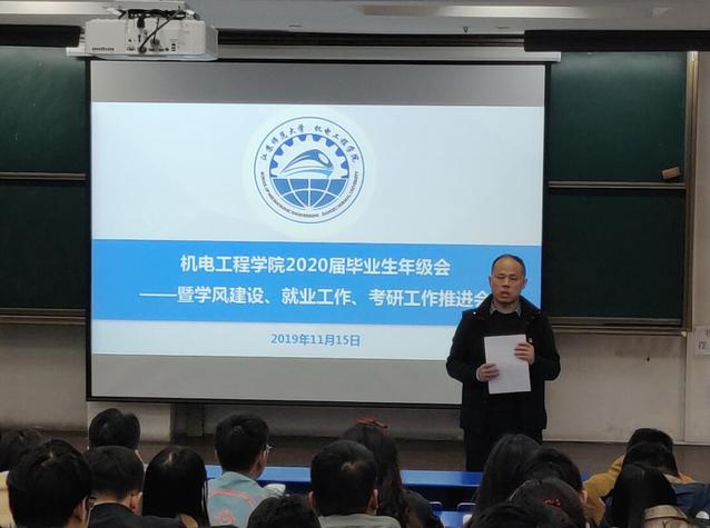 11月15日下午2:10,机电工程学院于8#J102召开2020届毕业生年级会暨学风建设就业工作推进会。机电工程学院2020届毕业生参加了此次会议,机电工程学院党委副书记梁宝文、教务老师刘凤国、就业辅导员丁永剑参加了年级会。年级会由辅导员丁永剑老师主持。