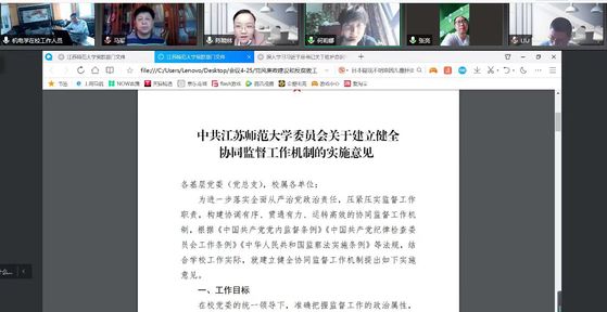 会议同时组织学院班子成员集中学习了《中共江苏师范大学委员会关于建立健全协同监督工作机制的实施意见》,并详细贯彻传达了学校党风廉政建设和反腐败工作协调小组会议精神。