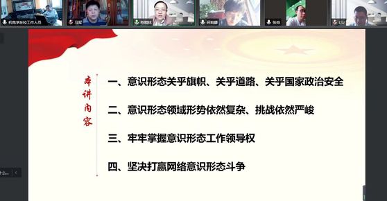 与会人员重点围绕以下四个方面开展了学习:“意识形态关乎旗帜、关乎道路、关乎国家政治安全”,“意识形态领域形势依然复杂、挑战依然严峻”,“牢牢掌握意识形态工作领导权”,“坚持打赢意识形态斗争”。