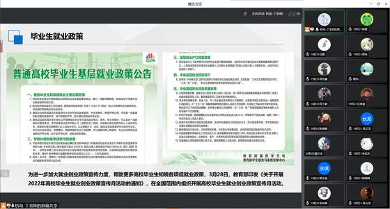 会上,丁永剑老师分别就2022年西部计划、江苏大学生志愿服务乡村振兴计划等基层就业项目的招募条件、报名方式、选拔流程、政策支持等基本情况进行了详细解读,使同学们深入了解到面向基层就业的最新政策,号召更多毕业生投身乡村振兴战略,到西部、到基层、到祖国最需要的地方绽放青春光彩,实现人生价值。