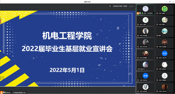 为持续扎实做好2022届毕业生就业工作,加强毕业生对基层就业项目的了解认识,鼓励毕业生将青春梦想在基层工作中得到淬炼,5月1日晚上,机电工程学院举办2022届毕业生基层就业宣讲会,会议由丁永剑老师主持。