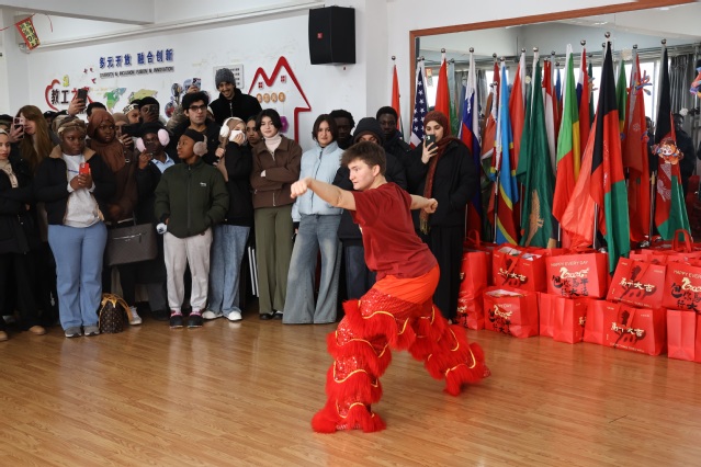 活动紧扣“沉浸式文化体验”主线,设置“翰墨迎春”与“趣味游园”两大互动专区。在墨香氤氲的301室,商校长驻足观看留学生们提笔写“福”、体验年画拓印、巧制毛毡灯笼等,称赞大家“一撇一捺见功底,一拓一印传匠心”。401室内欢声笑语不断,投壶、套圈等传统游戏引得师生竞相参与,美国籍留学生陶海晨表演的舞狮与大洪拳更将现场气氛推向高潮,掌声经久不息。