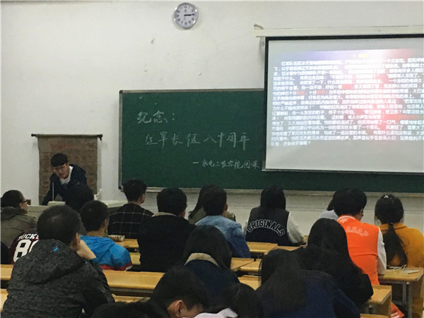 为纪念中国工农红军长征胜利80周年,弘扬拼搏不息、艰苦奋斗、勇往直前的精神,11月2日晚,机电工程学院分团委在12#103C开展了以“纪念长征胜利80周年”为主题的团课活动。分团委成员及各班团干积极响应,以丰富的团课形式来追寻红色足迹,弘扬长征精神。团课由机电工程学院分团委副书记单梦晨主持。