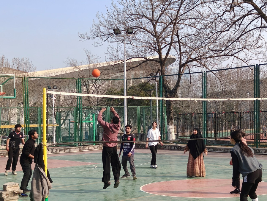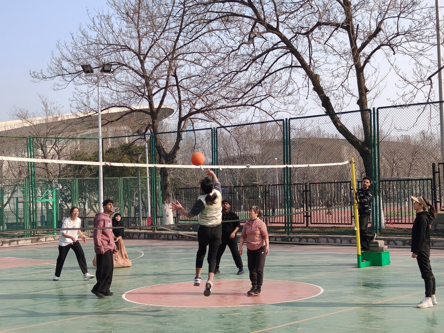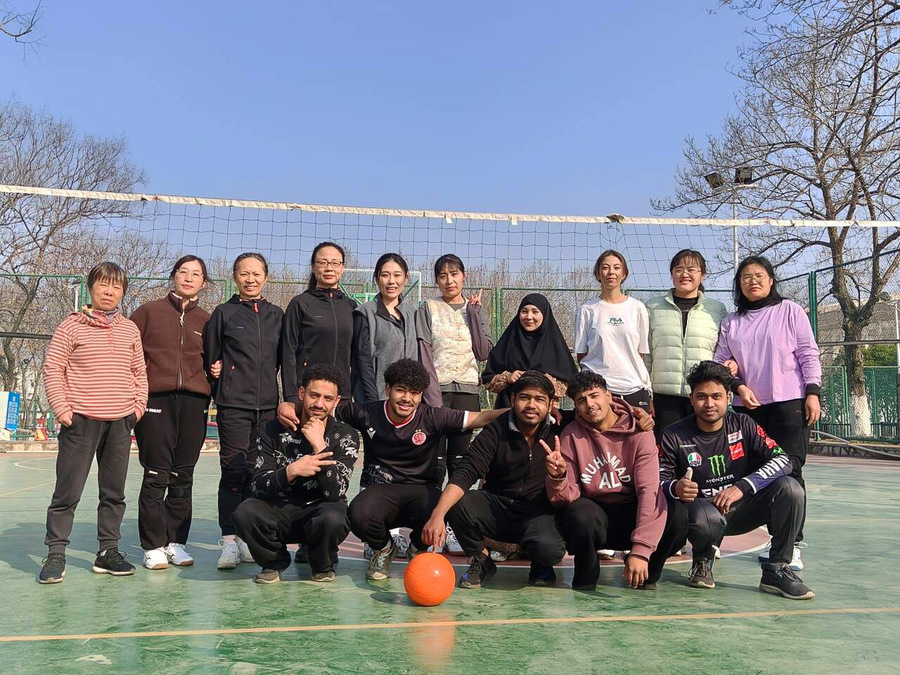 3月7日下午,阳光正好,学校室外排球场早早热闹起来。来自各院系的女教职工与摩洛哥、孟加拉、也门等国留学生球友们欢聚一堂,以一场别开生面的中外师生软排联谊赛,共庆“三八”国际妇女节。