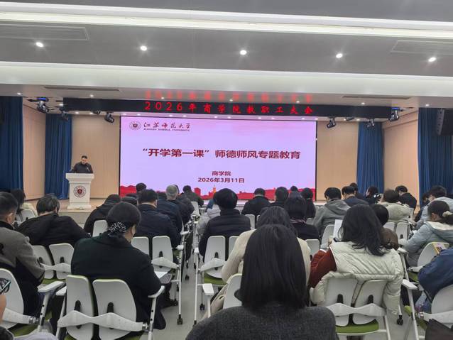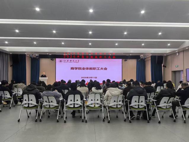 3月11日下午2:00,商学院在路演大厅召开2026年春季学期全体教职工大会暨“开学第一课”师德师风专题教育。学院全体教职工参加会议,会议由学院党委书记李亚东主持。