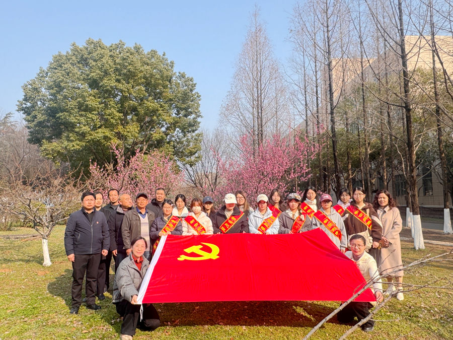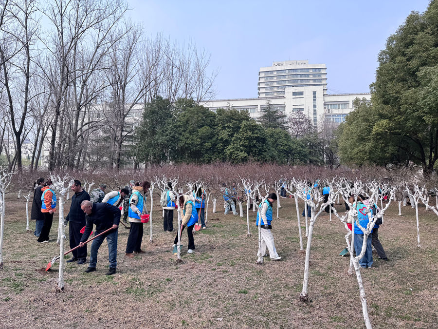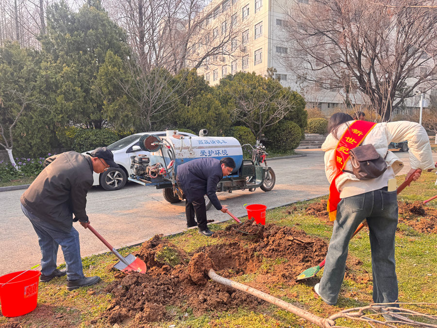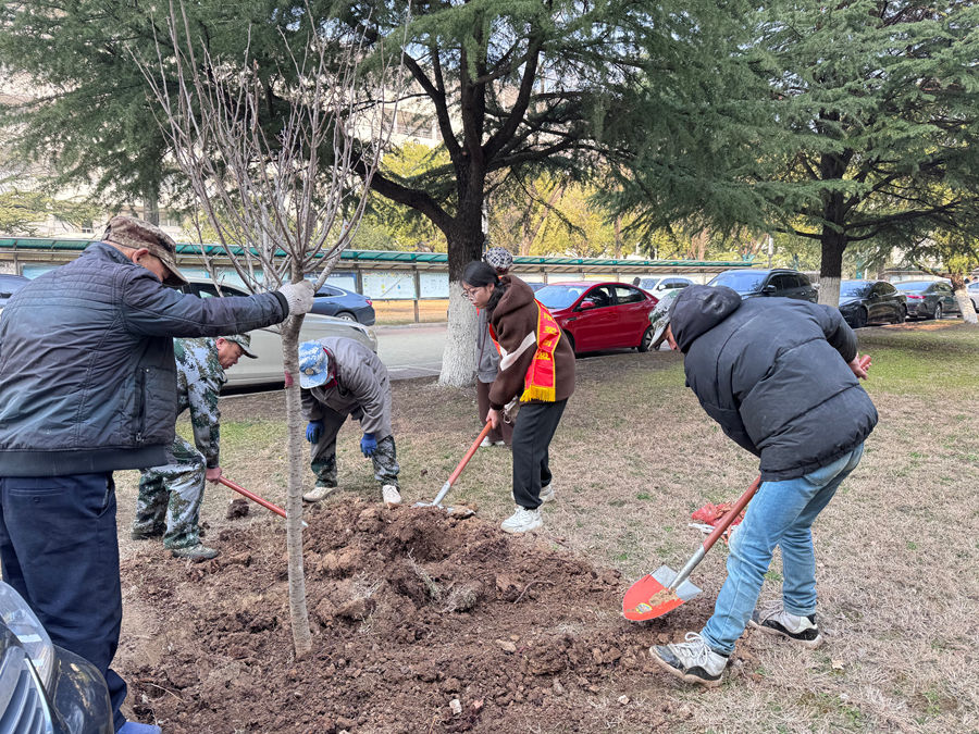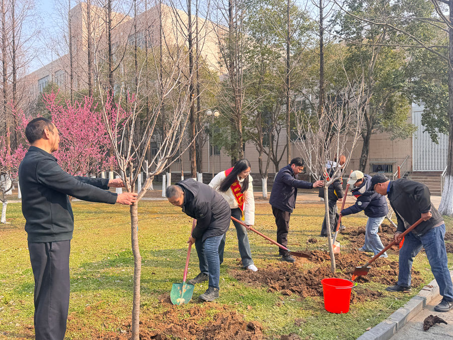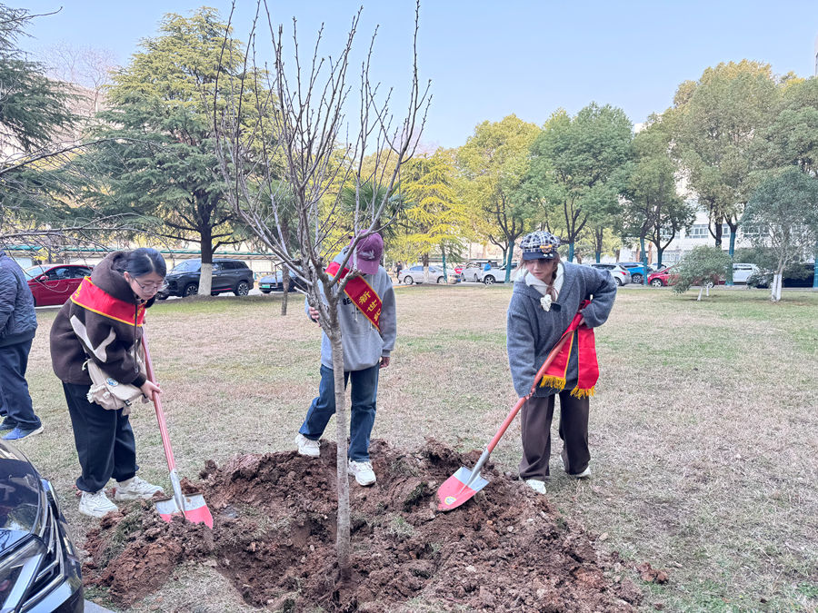 3月11日下午,植树活动在校友林东侧牡丹园正式启动。新世纪限塑同盟师生代表与支部党员齐聚现场,党支部书记翟广路现场讲解植树要领与安全注意事项,明确操作规范,保障活动安全高效开展。劳动现场气氛热烈、秩序井然,各小组分工协作、默契配合,挖坑、扶苗、填土、浇水等环节衔接有序。党员同志冲锋在前、率先垂范,充分发挥先锋模范作用,与师生一同挥锹培土、躬身劳作,用汗水浇灌新苗,以行动种下希望,展现出团结协作、奋勇争先的良好精神风貌。经过辛勤耕耘,十株樱花树苗迎风挺立,为校园再添盎然生机。