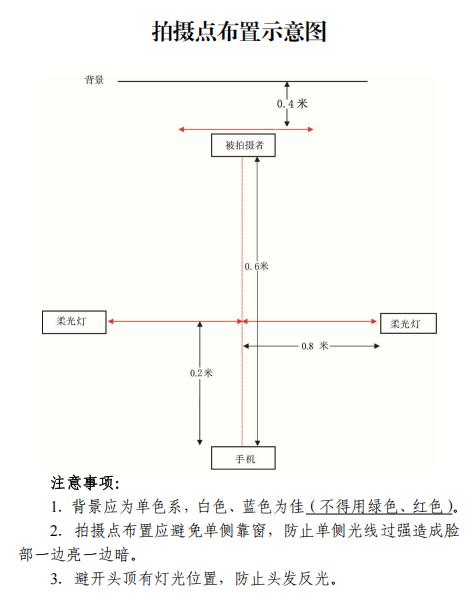 1.光线:建议面向窗户,自然光拍摄(避免阳光直射,不建议晚间拍摄),保证面部光线均匀,无明显可见或不对称的高光、光斑,无红眼。