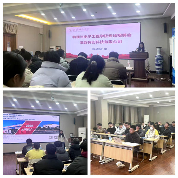 为深入贯彻落实学校2026届毕业生就业工作部署,精准对接毕业生求职需求与用人单位引才需求,3月19日至20日,物理与电子工程学院举办淮安特创科技有限公司招聘宣讲会暨访企拓岗座谈会。