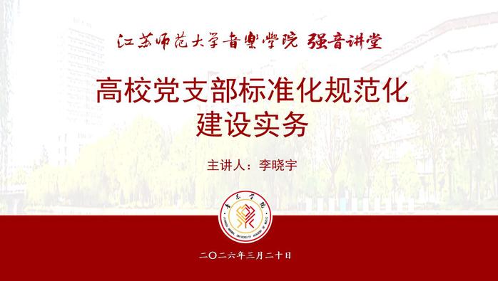 3月20日下午,音乐学院第3期“强音讲堂”暨2026年度管理干部第一次集中培训在学院“红乐章”党建工作空间举行。校党委组织部副部长、专职组织员李晓宇,应邀做了题为“强基固本 守正创新——新时代高校党支部标准化规范化建设”的专题辅导讲座,学院党委书记高小平主持活动,副书记唐婉莹、相关办公室人员以及各党支部成员参加了活动。
