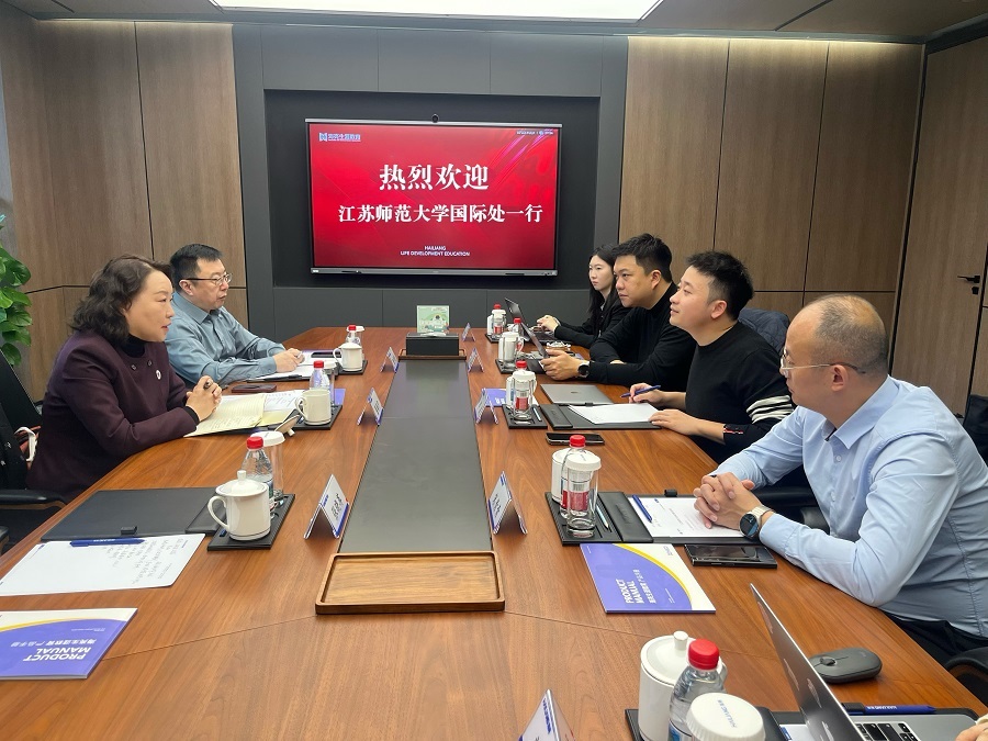在海亮教育集团,海亮教育集团助理总裁、海亮生涯教育总经理邵嶷代表海亮教育集团对董海宁一行的到来表示热烈欢迎。他介绍了海亮教育集团的发展历程、业务布局及在生涯规划、国际教育、区域人才培养等领域的优势。他表示,希望以此次座谈为契机,在国际化人才培养等方面深化合作,实现资源共享、优势互补。董海宁简要介绍了学校国际合作交流的总体情况。她指出,江苏师范大学正坚定不移推进高水平教育对外开放,锚定“引进来”和“走出去”双向发力。海亮集团作为享誉全球的世界500强企业,综合实力雄厚、行业口碑卓著。海亮教育更是中国民办基础教育的标杆典范,双方以人为本的教育理念高度契合,合作空间广阔、潜力巨大。希望双方抢抓机遇,率先探索“高校+头部企业”协同育人新模式,打造校企国际化合作新样板。随后,双方就项目合作的具体细节进行了深入交流,围绕生源渠道、课程设置、质量保障等方面充分交换意见,达成广泛共识。座谈结束后,双方签署了框架协议,并实地参观考察了海亮集团相关产业板块。