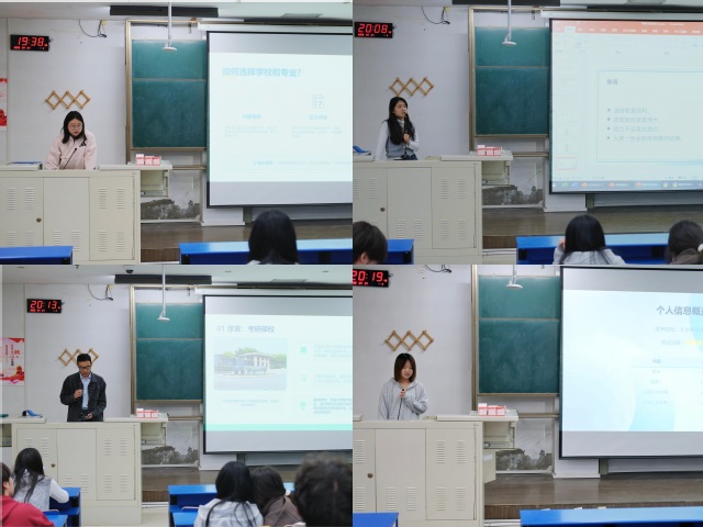随后,2022级王琳、黄一诺、鲁粉、陈松4位优秀的考研学子依次开展了经验分享,结合自身备考经历,从院校专业选择、复习计划制定、时间管理方法、心态调整策略等方面,分享了详实的备考经验与心得体会,现场交流氛围热烈,为有考研意向的同学提供了可借鉴、可操作的实用经验,进一步坚定了大家的备考信心。