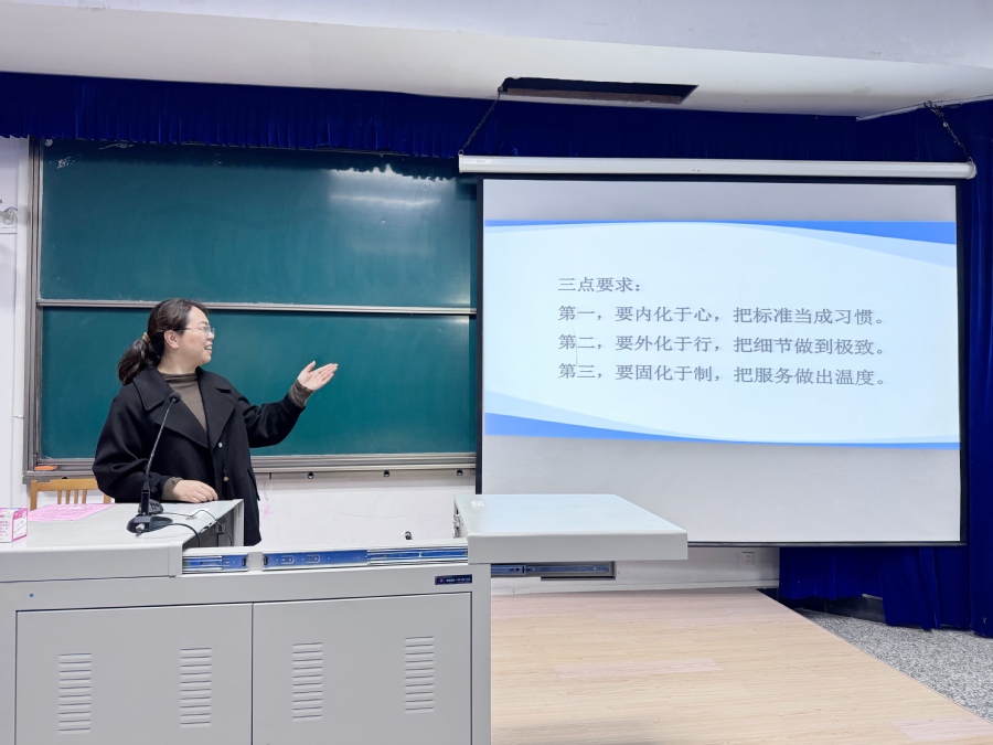 培训会上,焦文静副主任指出,保洁工作并非简单的重复性劳动,而是承载着服务育人使命的专业化服务。每一块光洁的镜面、每一处无尘的角落,都是后勤人对“标准”二字的生动诠释。她希望全体人员通过实操训练与日常巩固,持续提升服务的标准化与规范化水平,进而全面提高整体服务质量。