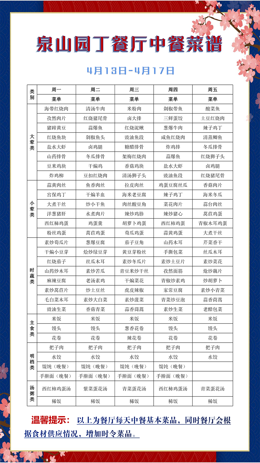 泉山园丁餐厅、云龙教工窗口中餐菜谱(4月13日-4月17日)