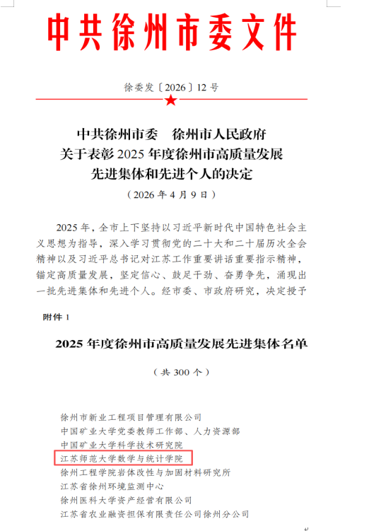 4月9日,中共徐州市委、徐州市人民政府联合下发《关于表彰2025年度徐州市高质量发展先进集体和先进个人的决定》,对全市在推动高质量发展中表现突出的集体和个人予以表彰。经学校推荐,数学与统计学院在学科建设、科技创新、育人实践及服务地方发展等多方面表现突出,被授予“2025年度徐州市高质量发展先进集体”荣誉称号。