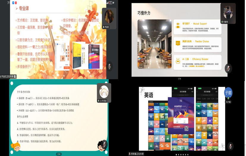 会上,四位优秀上岸学子结合自身备考经历倾囊相授:齐远红(初试成绩第一,考取我校音乐表演专业)熟知各科复习技巧,强调心态赋能与科学放松相结合,助力高效备考;何嘉程(考取我校作曲专业)聚焦科学规划与高效执行,分享实用备考工具与方法,为同学们搭建高效备考框架;朱语涵(考取南京师范大学舞蹈教育专业)系统梳理三阶段备考流程,重点提醒同学们要平衡专业练功与文化学习,做到两不误、双提升;马子懿(考取上海大学戏剧与影视学专业)侧重心态调节,鼓励同学们正视焦虑、拒绝内耗,以坚定的信念和持久的坚持奔赴目标。