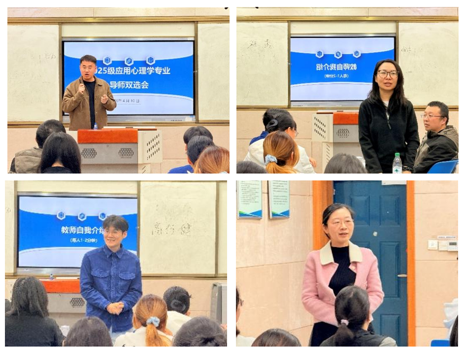 为充分发挥专业教师在学生成长过程中的引领作用,搭建师生常态化、深层次的交流平台,4月10日下午,教育科学学院2025级应用心理学专业导师双选会在13号楼209教室举行。教育科学学院心理学系全体教师与2025级应用心理学专业48名学生共同参会。