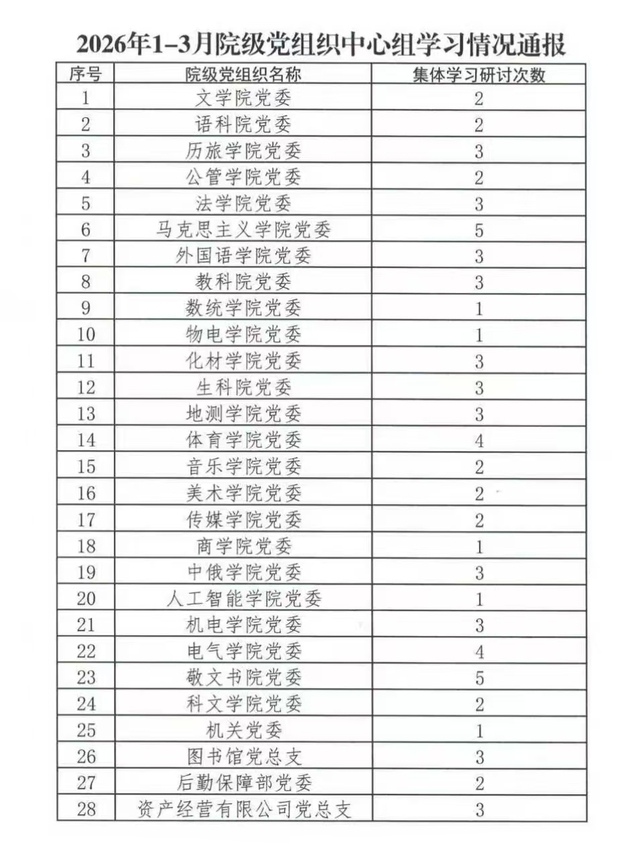 根据学校工作安排,自2026年4月起,对各院级党组织理论学习中心组学习情况实行月度通报。学校将于次月15日前通报各院级党组织中心组的上月学习情况。现将1—3月各院级党组织中心组集体学习研讨情况通报如下。