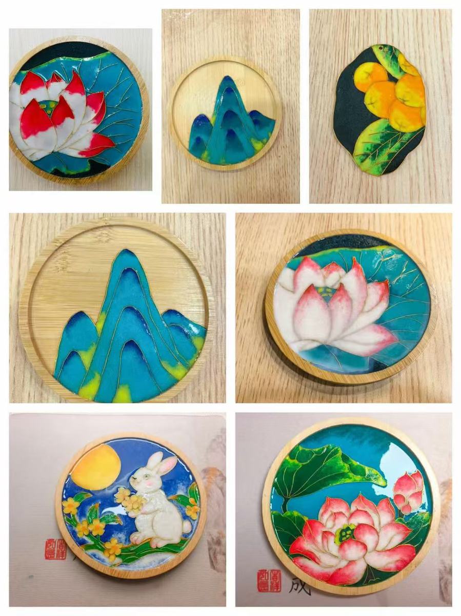 实操环节,李士娟老师现场示范掐丝、点蓝、粘胎、固砂等核心工序,手把手指导技法要点。参与教师认真投入、耐心实践,从捋丝、弯线到填砂、装饰,一步步精心打磨。面对铜丝塑形、彩砂铺匀等实操难题,大家相互交流、互帮互助,以专注与耐心攻克细节,一件件主题鲜明、形制雅致的掐丝珐琅杯垫、书签陆续完成,花鸟鱼果、山水意象在方寸之间跃然成型,尽显匠心巧思。