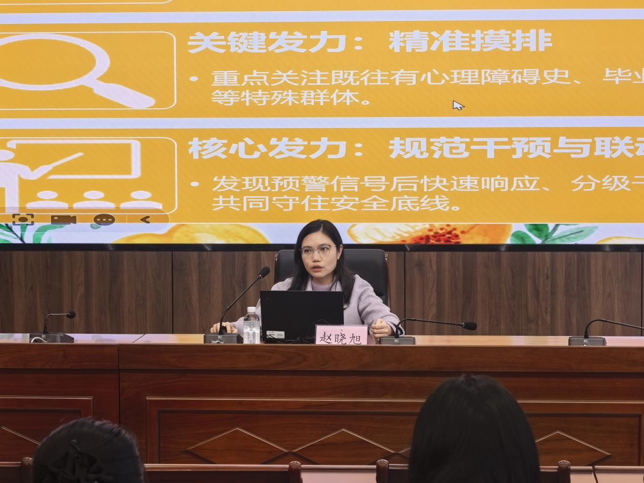 会议第一阶段,开展心理健康教育工作专题培训。校心理健康中心赵晓旭老师应邀作《高校心理危机预防与干预》专题讲座,围绕大学生心理危机识别、预警机制构建、应急干预流程与实操方法进行系统讲解,帮助研究生导师、班主任和辅导员进一步提升心理育人与风险防范能力,为学生心理健康保驾护航。