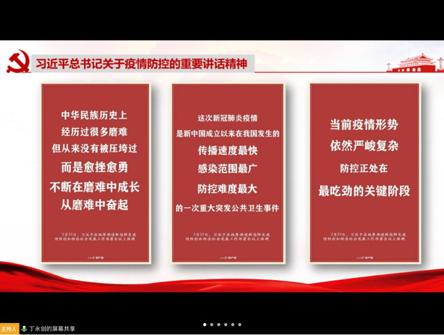 云党课上,丁老师首先向大家介绍了全国疫情防控形势和学校党委、学院党委对疫情防控工作的部署和具体安排,总结了疫情防控期间学生党支部的工作,并从学习习近平总书记重要讲话精神、学校《致全校各级党组织和全体党员的倡议书》、抗“疫”一线共产党员典型事迹与发挥学生党员先锋模范作用四个方面展开主题党课。讲解中,丁老师希望学生党员做到坚定理想信念、做好居家防护、服从学校安排、聚焦当前学业、不负青春使命,发挥好先锋模范作用,积极践行党员的初心和使命。