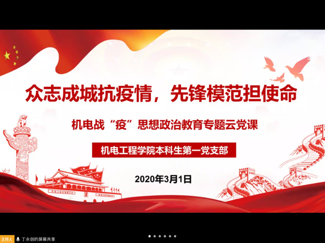 为深入学习贯彻习近平总书记对新型冠状病毒感染的肺炎疫情的重要指示精神,落实学校、学院党委相关工作部署,发挥学生党支部在疫情防控工作中的战斗堡垒作用,发挥学生党员的先锋模范作用,机电工程学院本科生第一党支部于3月1日召开了“众志成城抗疫情,先锋模范担使命”专题云党课。本次专题云党课由本科生第一党支部书记丁永剑老师主持,支部全体学生党员参加了此次会议。
