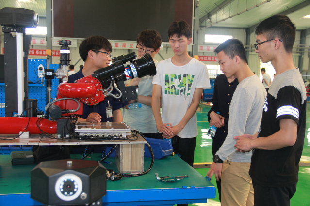 徐州鑫科机器人有限公司张钧晟总经理对我校师生进行了热烈欢迎,此次参观分为企业概况介绍、观看企业宣传片、参观生产车间、产品现场演示以及企业人才需求讲解等主要环节。参观期间,我院学生认真向现场技术人员请教学习,并对其中一些技术细节同工作人员进行交流;在消防灭火机器人现场演示环节,同学们不时发出惊呼,来自14机41班的黄金峰同学就机器人的现场表现向机器人的设计人员提出了自己的见解,得到了现场工作人员的赞赏;陈子宁同学抓住机会,亲身体验了对机器人的操控。最后,公司领导和员工与同学们进行了深入的交流互动,并与大家合影留念。