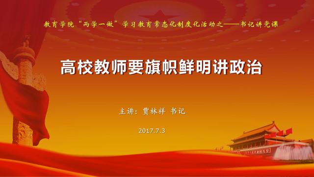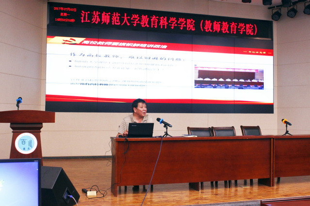 为进一步学习贯彻党的十八届六中全会精神及我校关于《江苏师范大学推进“两学一做”学习教育常态化制度化工作方案》的要求,7月3日下午,我院党委书记贾林祥教授院在多功能报告厅做了“高校教师要旗帜鲜明讲政治”的专题党课,教育学院党委委员及全体教师党员参加了此次活动。