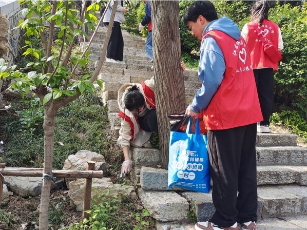 志愿者们有序分组编队,明确责任分工和服务区域,他们同意穿着红色马甲,手拿垃圾袋等工具,在云龙山各路段清理打扫道路两侧的垃圾、乱石和杂草,登上一级级台阶捡拾不可降解垃圾,通过身体力行,传递环保意识,用自身的实际行动为保护云龙山生态环境贡献一份力量。在志愿者的示范带动下,前来游玩的孩子在父母的引导下,也加入了捡拾垃圾队伍中来。活动中,志愿者在通行的路上对随手扔垃圾的市民进行劝阻,倡导市民保护环境、文明出行。