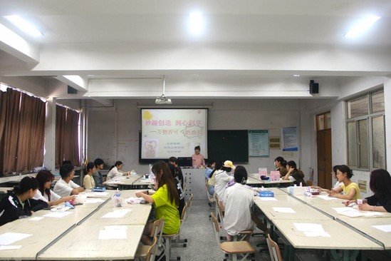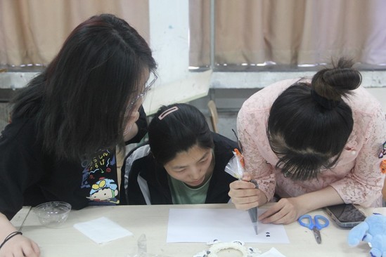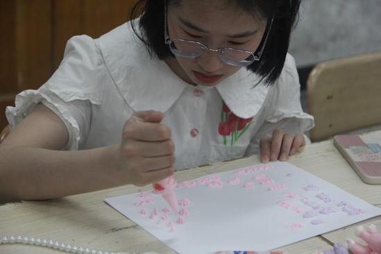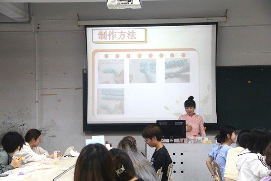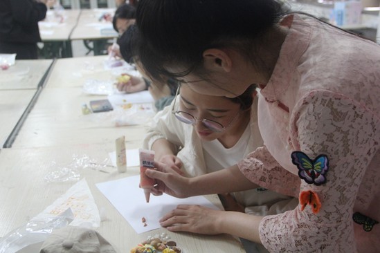 活动现场,赵老师首先向学生讲解奶油胶艺术品操作方法和注意事项,详细介绍了六种基本花型(波浪型、螺旋型、曲奇型、爱心型、贝壳型、玫瑰花型)以及高阶花型的制作技巧。赵老师详细讲解了选材—裱花—镶嵌—风干整个流程,引领学生深入直观地感受奶油胶手工制作的魅力。
