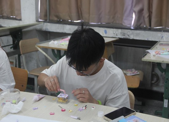 在老师的指导演示下,学生先练习几种基础花型的技巧,在此基础上,用奶油胶和小饰品制作自己喜欢的模型。赵老师现场指导学生根据自己的喜好选择制作奶油胶手机支架、花环、手摇音乐盒、小夜灯等手工艺术品。同学们在老师的耐心指导下,自己动手、互相配合创造出自己独一无二的作品。“哇,你做得也太好看了!”“你可以教我吗?” “老师你看我做的漂亮不!” ……活动现场充满了欢声笑语,洋溢着快乐气氛。