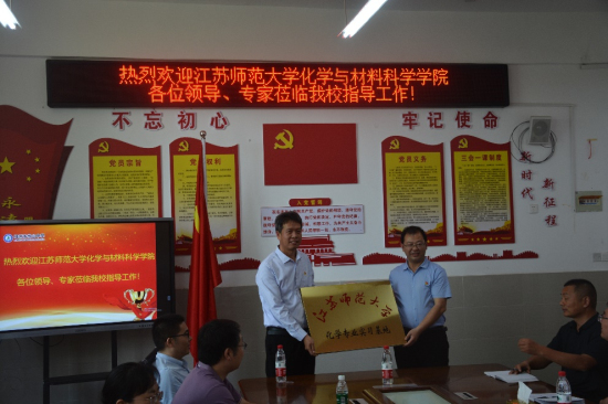 6月3日上午,化学与材料科学学院党委王香善书记带领教工一支部部分党员到邳州市岱山中学开展教学实践(实训)指导活动。岱山中学刘峰校长对王书记一行的来访表示热烈欢迎,并带领大家参观岱山中学学生食堂、宿舍和化学实验室,具体介绍了岱山中学近年发展历程和未来发展规划等情况。在听取刘校长介绍后,王书记简要介绍了化学学院的学科发展、专业建设、人才培养以及师资培训等方面取得的进展。随后,与会双方就教育教学实践中所存在的疑难问题及教师个人成长的困难与邳州市岱山中学化学、数学、物理等老师代表进行了深入交流沟通。活动现场还举行了江苏师范大学化学与材料科学学院教学实践(实训)指导学校授牌仪式。