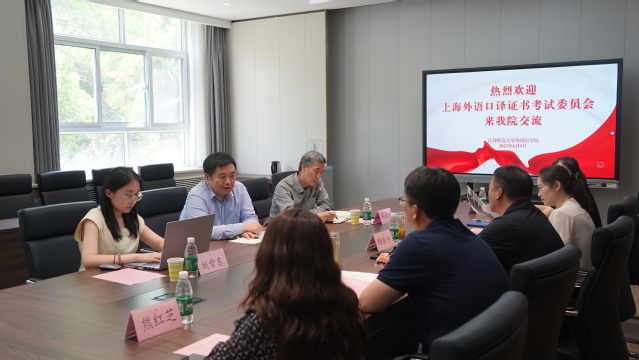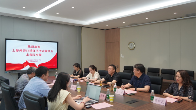 院长于涛代表学院对上海外语口译证书考试委员会领导专家的到来表示热烈欢迎,介绍了学院基本情况和考点建设情况。张廷佺副主任介绍了上海外语口译证书考试近年来的发展状况和今后工作的规划和设想,并对我院考点建设和历次考试组织取得的成绩表示赞赏。副院长夏志华介绍了学院专业建设情况及专业特色,报告了考试组织情况。