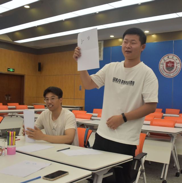活动伊始,李老师用“我与涂鸦”热身游戏引入。同学们用形象的符号画出自己的名字,小组成员相互竞猜并分享对自己名字的解释,引导同学们觉察自己,相互认识。随后,伴随着舒缓的音乐,李老师用引导语带领同学们闭上眼睛,聆听内心,从脚底开始逐步进行内部区域、中间区域和外部区域的自我觉察。通过觉察,同学们更加意识到自己的存在,感受到自身的能量和力量,让同学们在忙碌的科研生活中重新与自己建立联系,找回内心的平静与力量。