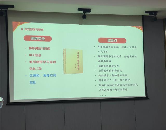 首先,王树果详细介绍了学院党委制定的主题教育实施方案,并强调支部将立足专业特色开展系列理论学习和实践活动。随后,王树果结合《习近平著作选读》第一卷,介绍了这本书里有与本支部专业有密切关联的部分,例如在军事方面,军队的现代化建设离不开测绘和地理信息技术的支持,可以为军事行动提供精准情报,为一些武器提供精确的地心坐标和精确的地球重力场数据;在粮食安全方面,测绘、遥感、地理信息技术也已经发挥了重要作用,例如在大面积种植区域,采用无人机、无人车的作业方式已经较为普遍;在“一带一路”建设方面,基础设施的互联互通,测绘地理信息具有重要的先行基础作用;以及近十多年来,遥感事业进入了快速发展阶段,商业化遥感蓬勃发展,将进一步助推国民经济和社会的发展和数字中国的建设。接着,全体党员共同观看了主题教育专题学习片《嘱托·奋进》。