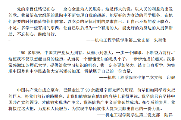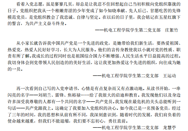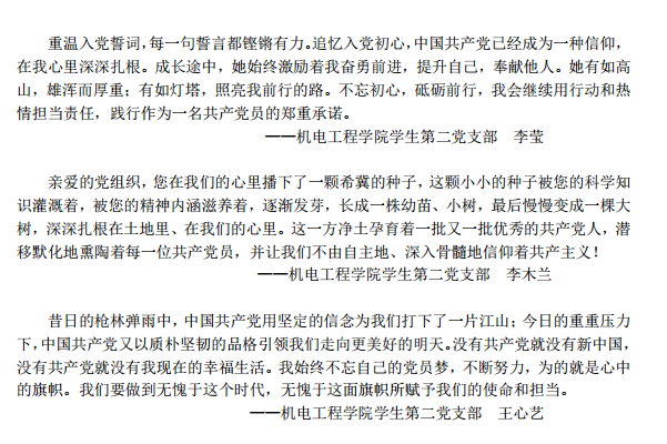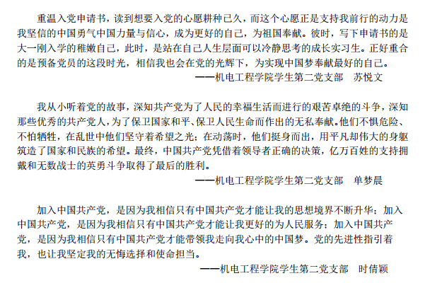 活动伊始,支部书记刘萌老师介绍了本次党日活动的初衷和意义,为深入学习贯彻党的十九大精神,不断提高支部党员的政治理论水平,增强党性修养。本次活动通过“重温入党申请书”的形式,让学生党员认真阅读自己写的入党申请书,一笔一句都饱含了向党组织靠拢的决心。支部成员依次分享了入党申请书中最激励自己的一段话,通过发言和认真聆听,一起追忆入党初心,回顾成长历程。随后,刘老师结合自己的入党历程和学习体会,与同学们交流了心得体会,大家积极踊跃发言,讨论气氛热烈。活动结束后,所有支部成员撰写了一段话微心语,将学习体会凝练成语言表达出来。