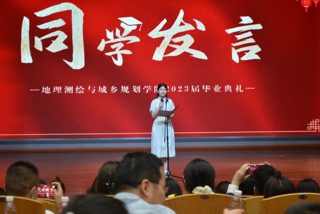 地测学院党委尹燕萍书记进行致辞,勉励毕业生们奋发向上,自强不息,靠双手让梦想腾飞,让未来绽放。毕业生代表吉泽敏同学上台发言,传达了来自毕业生对地测学院的美好祝福,以及对学弟学妹们大学时光的建议。地测学院梁亮副院长、张忠启副院长分别为2023届本科生、研究生代表拨穗。地测学院刘洁副书记为扎根基层、教书育人、升学深造的优秀毕业生代表颁奖。整场晚会分为“朝时相携初相遇”“青葱岁月 展芳华”和“踏歌远航 扬新帆”三个篇章,一段段来自领导、老师、辅导员、校友以及毕业生等的视频寄语,表达了地测人对2023届毕业生以及地测学院的美好祝愿与期许。从舞蹈《shootingstar》开始,十佳歌手合唱《凤凰花开的路口》、相声《谁让你优秀》、舞蹈《Cupid》、《what is love》、合唱《我想要》、乐队《星空》《阳光宅男》、幕布剧《我的大学》、中国风舞蹈《流光叙》等精彩纷呈的节目演绎了2023届毕业生从邂逅母校到挥别母校,一路追梦成长的点滴,晚会在大合唱《再见》中落下帷幕。