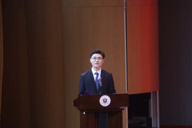 19联工31班班长连顺祥同学作为毕业生代表发言。他带领同学们一起回顾四年大学生活,表达了对母校、师长和同窗的感恩之情,同时也许下了“愿我们在身处时代洪流之时,仍能听从内心的召唤,永远是肩上飞扬有风、心似滚烫火焰的有梦少年,所遇皆良善,所行化坦途”的美好祝愿。