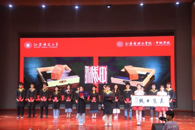 在视频《祝福》中,典礼第二篇章《杨帆行•闪耀星光》正式开启。江苏圣理工学院-中俄学院副院长李顺才宣读了《江苏圣理工学院-中俄学院关于表彰2023届本科毕业生升学榜样的决定》,并颁发荣誉证书。