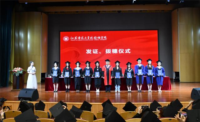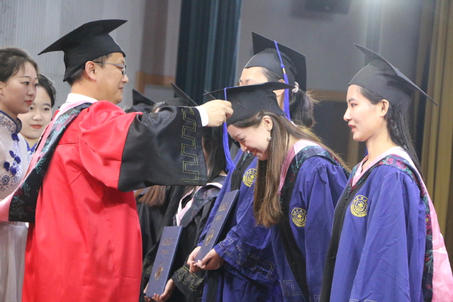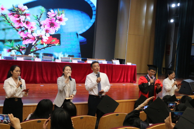 学院领导、学院学位评定委员会委员为全体毕业生授予学位证书并拨穗。