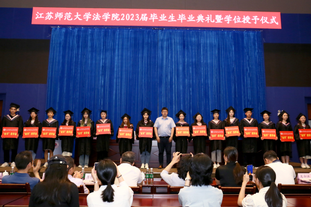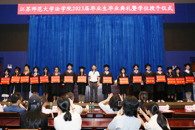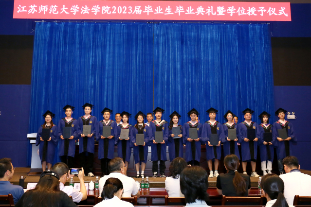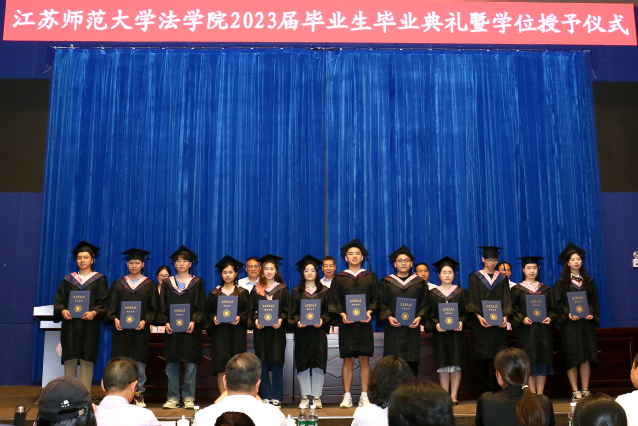 随后,法学院领导班子全体成员为2023届毕业生拨穗正冠并授予学位证书。在江苏师范大学法学院求学问道的岁月里,全体毕业生不畏艰难,永不言弃,在被新冠肺炎疫情笼罩的困难时期风雨兼程,赢得了一场场人生大考的最终胜利,真的不容易,真的了不起!