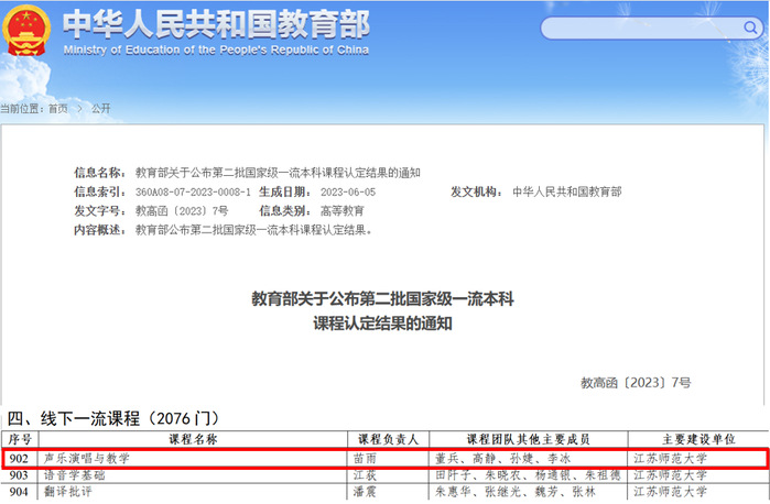 教育部近日发布了《关于公布第二批国家级一流本科课程认定结果的通知》(教高函〔2023〕7号),根据《教育部办公厅关于开展第二批国家级一流本科课程认定工作的通知》(教高厅函〔2021〕13号)的有关要求,最终认定5750门课程为第二批国家级一流本科课程。其中,线上课程1095门,虚拟仿真实验教学课程472门,线上线下混合式课程1800门,线下课程2076门,社会实践课程307门。第二批国家级一流本科课程中的音乐、舞蹈类课程共计80余门,其中线下课程40余门。