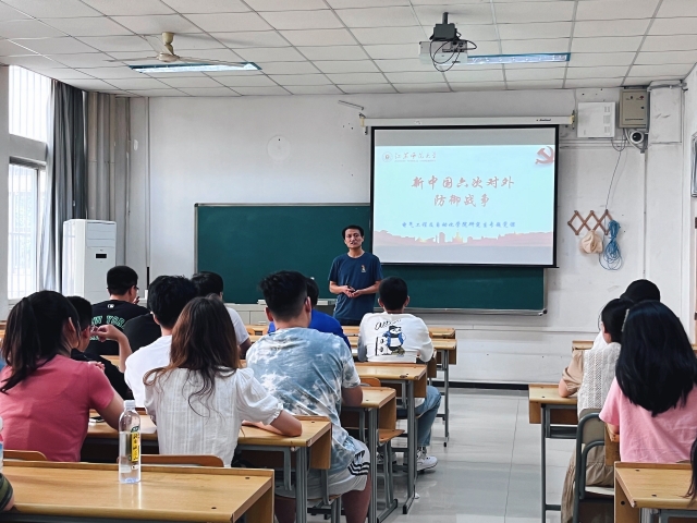 6月16日下午,李荣婧副书记以“抗日战争与民族精神”为题,为本科生党支部讲授专题党课。通过回顾14年的浴血奋战,引导学生党员从党的历史中理解百年大党兴党强党的密码,忠诚履职、实干担当,以实际行动传承抗战精神。