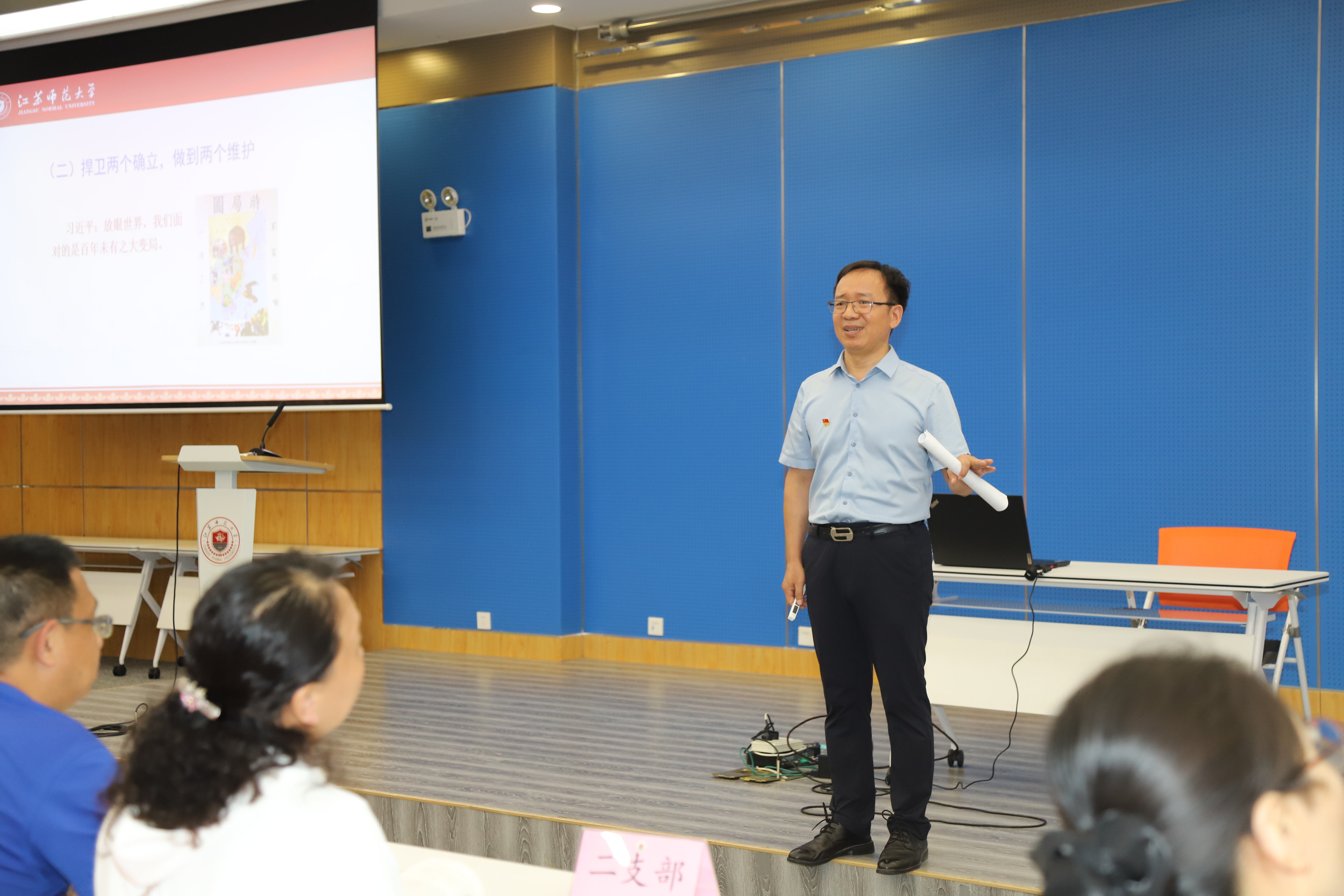 蒋国杰书记引用丰富的中外历史资料,分别对中国政治制度的优势与西方政治制度的困境进行了对比说明,以翔实的数据、生动的案例有力证明马克思主义的中国篇章是中国共产党人依靠自身力量实践出来的;党的百年奋斗成功道路是党领导人民独立自主探索开辟出来的,中国特色社会主义道路是正确的、科学的道路,是带领我们走向辉煌的康庄大道。我们要坚持对马克思主义的坚定信仰,坚持对中国特色社会主义的坚定信念,坚定道路自信、理论自信、制度自信、文化自信。蒋书记号召集团党员同志,要永远跟党走,一是要提高政治站位,坚定实现中华民族伟大复兴的理想信念;二是要捍卫“两个确立”,坚决维护习近平总书记和党中央的权威;三是要立足工作岗位,守得住安全,服务好师生,履职尽责当先锋,服务育人作表率。