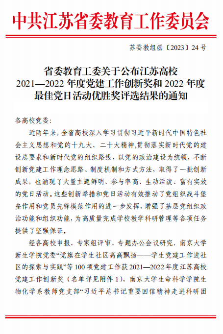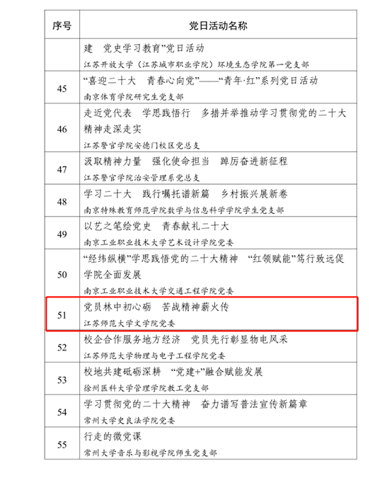 近日,江苏省委教育工委印发了《省委教育工委关于公布江苏高校2021—2022年度党建工作创新奖和2022年度最佳党日活动优胜奖评选结果的通知》(苏委教组函〔2023〕24号),徐州市委教育工委印发了《关于表彰全市教育系统优秀共产党员、优秀党务工作者、先进基层党组织的决定》(徐委教〔2023〕12号),经学校评审推荐,文学院党委申报的“党员林中初心砺 苦战精神薪火传”党日活动荣获2022年度江苏高校最佳党日活动优胜奖,文学院党委被授予徐州市教育系统“先进基层党组织”称号。