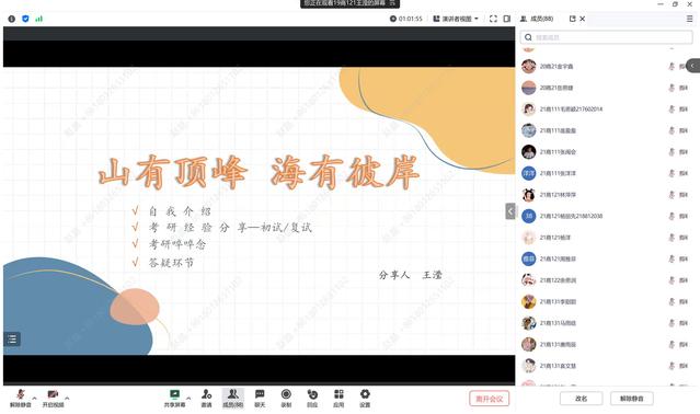 活动过程中,各位分享的同学结合自身备考经历对院校专业选择、学习方法技巧、困难解决办法、经验总结期望等方面做了详细讲解。此外,还提出了备考期间如何平衡实习、备考、考前如何调整心态及注意哪些关键的时间节点等技巧,强调考研关键在于自己要付出一定时间和精力,要认真对待,坚信“只要努力就会有收获。”