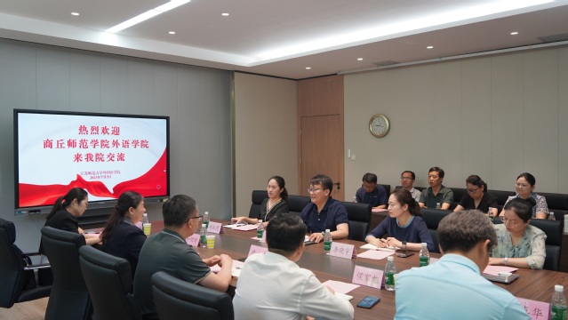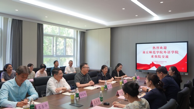 7月5日上午,商丘师范学院外语学院党委书记韩坤、院长孙艳玲一行12人来我院调研交流。学院领导班子和相关老师参加座谈。座谈会由院长于涛主持。