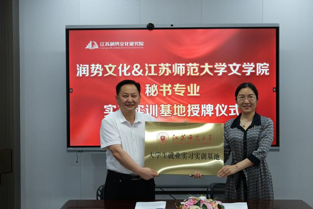 彭晨代表文学院与润势文化研究院马庆钊董事长签订了实习实训基地协议,向研究院颁授“大学生实习实训基地”牌,聘请马庆钊董事长、梁茂富常务副院长担任文学院秘书学本科生专业导师。