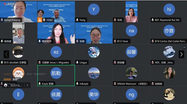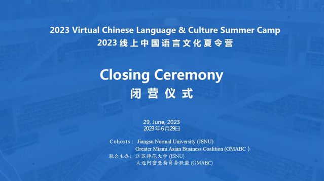 北京时间6月30日上午9点30分,江苏师范大学和美国大迈阿密亚裔商务联盟联合主办的2023年线上中国语言文化夏令营圆满闭营。闭营仪式由江苏师范大学国际学院副院长刘兴林主持,出席仪式的有大迈阿密亚裔商务联盟杨通银,大迈阿密亚裔商务联盟汉语考试中心主任左前,江苏师范大学国际合作交流处副处长毕冉和江苏师范大学国际学院院长侯铁建,来自美国南佛州的50多名大中小学生营员和江苏师范大学国际学院部分教师相聚“云端”参与本次夏令营闭营仪式。