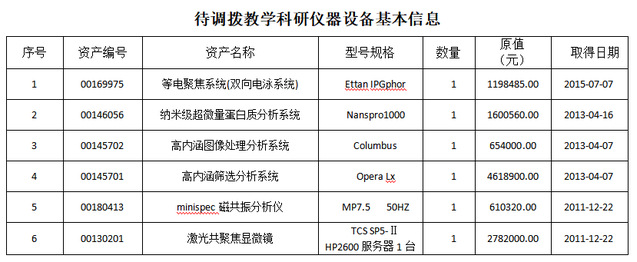兹有6台教学科研仪器设备,因在原使用单位利用率较低,现予以校内无偿调拨。设备基本信息如下表,详细介绍见附件。有需要的单位或个人请于本周日(7月16日)下班前,将书面申请交至实验室处设备管理科(泉山14#-207)。申请应包含使用需求、保管人、存放地、预计年使用机时、是否同意共享等内容。